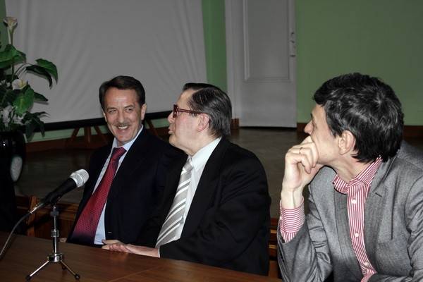 Сначала все шло по заведенному порядку: большой зал, тяжелые занавеси на окнах, рояль и интерактивная доска на сцене. Все места заняты почтенными пожилыми людьми в костюмах, нарядными женщинами среднего возраста и небольшим количеством студентов. Алексей Варламов оказался чрезвычайно интересным и знающим лектором. Сначала он рассказывал о работе над книгой, потом перешел непосредственно к жизненному пути Платонова. «Вообще мне неудобно рассказывать вам о Платонове, - сказал Алексей Николаевич. - Мне кажется, что вы знаете о нем больше меня. В творчестве Платонова сильно чувствуется воронежский акцент. Платонов – это целое явление. Та огромная энергия, которая возникла в России на ружебе веков, искала, в ком бы найти выход. Центральное место в его творчестве занимает понятие энергии. Как инженера его не просто увлекали проекты переустройства мира космического масштаба, но он пытался найти научное обоснование для них. Этим объясняется повышенный интерес Платонова к телу, хотя в молодости он отрицательно относился к любви и теме пола. Он размышлял, откуда человеку взять энергию для социалистического строительства, и пришел к выводу, что ее надо поднимать снизу вверх, отказываясь от личной жизни.
