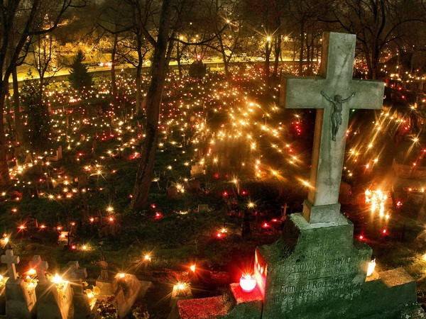 Свечи оставляют на могилах, чтобы отметить День Всех Святых на кладбище Росса в Вильнюсе, Литва. В Литве люди посещают кладбища в это время по всей стране в память об умерших.