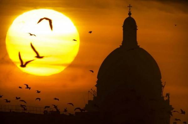 Исаакиевский собор в Санкт-Петербурге, солнце садится, силуэты.
