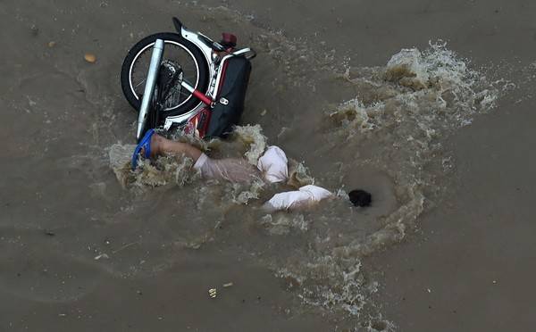Пакистанский мотоциклист падает в паводковые воды после сильного дождя в Лахоре 25 августа 2016 года.