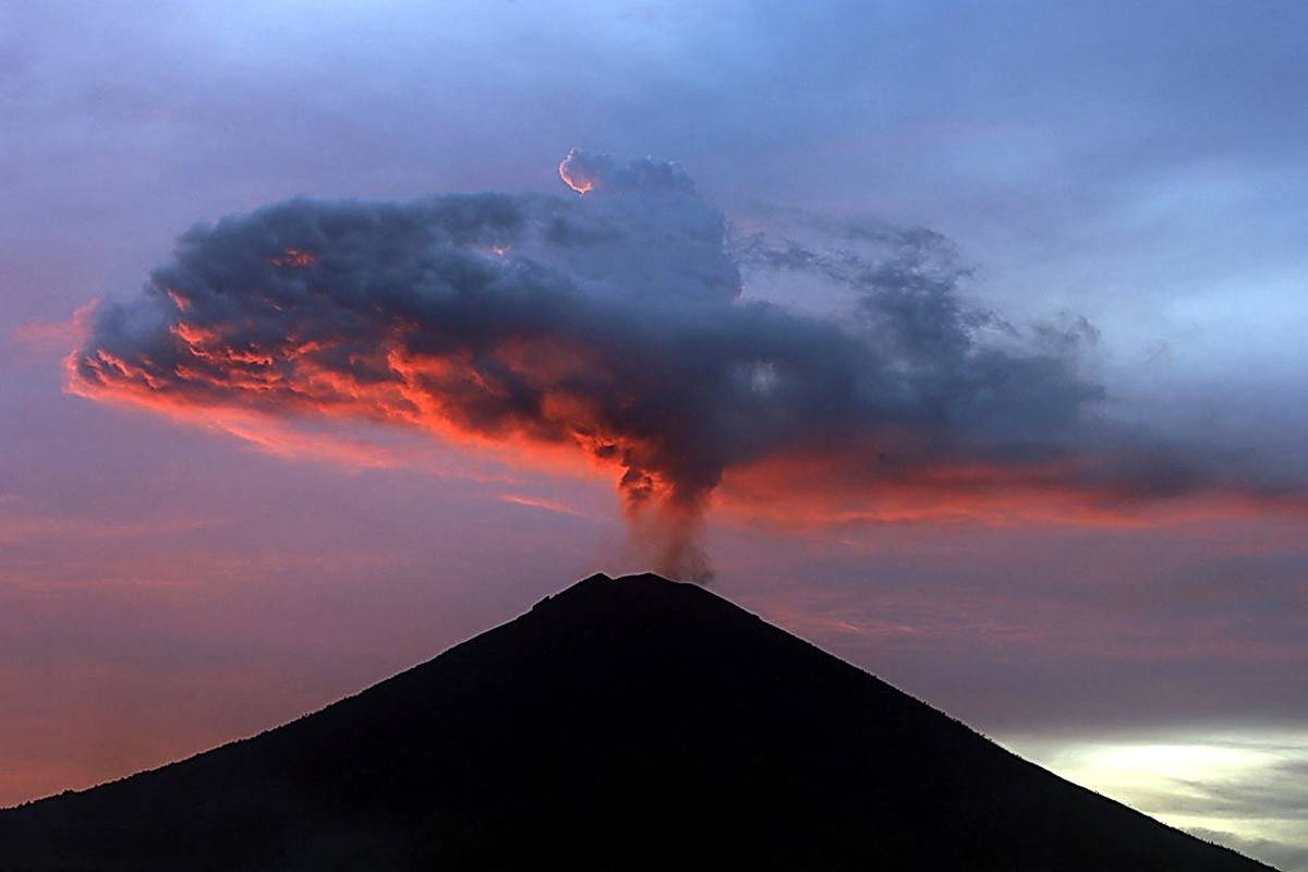 Облака пепла из вулкана Маунт-Агунг освещены тёплым светом заката в Карангасеме, Бали, Индонезия, 30 ноября 2017 года. Власти велели десяткам тысяч людей покинуть район, простирающийся на 10 километров от вулкана. Последнее крупное извержение горы Агунг в 1963 году убило около 1100 человек.