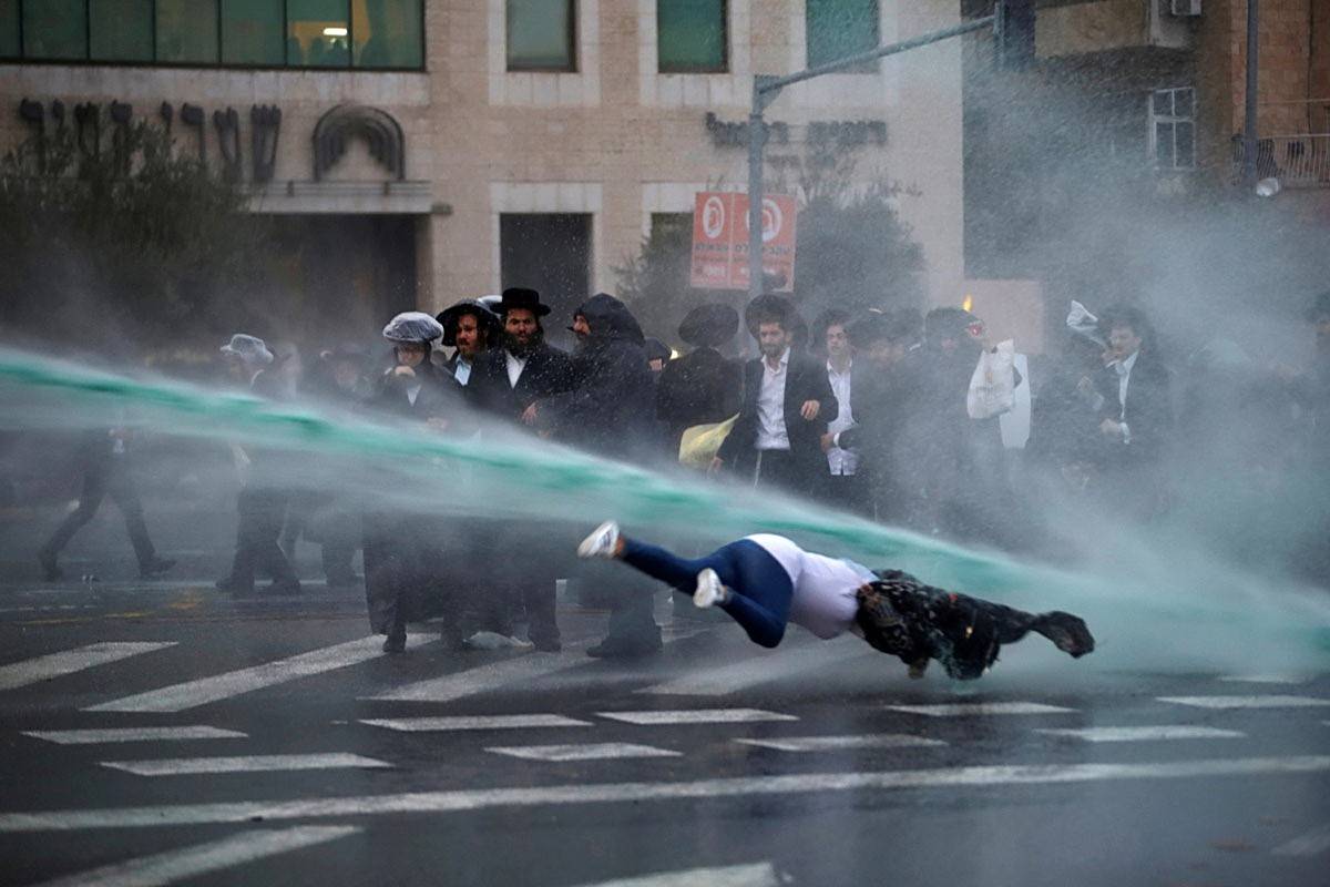 Участник демонстрации падает, подкошенный струёй воды израильской полиции. Так здесь расправляются с ультраортодоксальными иудеями. Снимок сделан в Иерусалиме 26 ноября 2017 года.