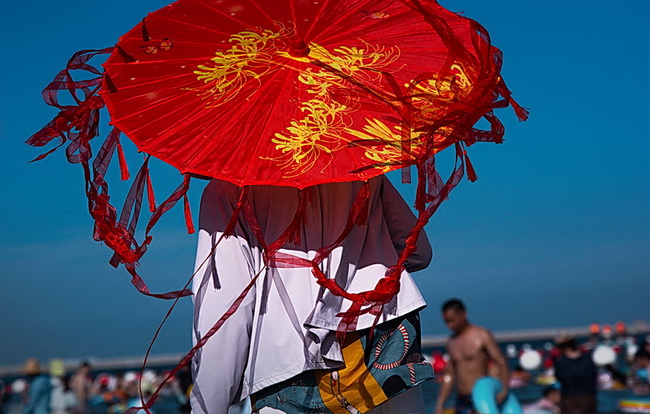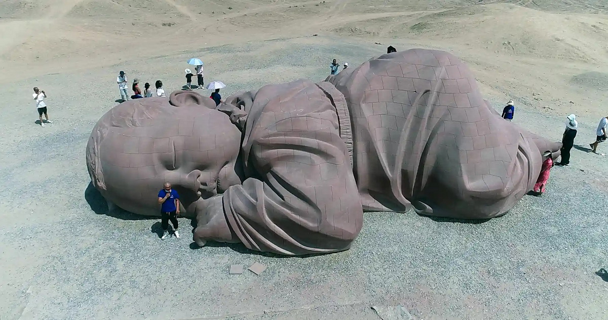 Цзюцюань, Китай. Люди осматривают скульптуру Сына Земли, огромного спящего младенца, установленную в пустыне Гоби в провинции Ганьсу. Имея длину 15 метров, высоту 4,3 метра и ширину 9 метров, Сын Земли был сделан из красного песчаника с использованием 3D-технологий. Автор – художник Донг Шу Бин.