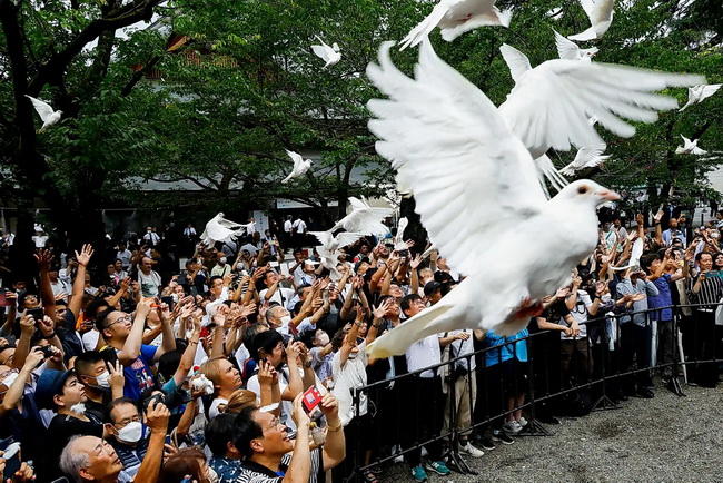 Токио, Япония. Люди выпускают голубей во время посещения храма Ясукуни в 78-ю годовщину капитуляции Японии во Второй мировой войне.