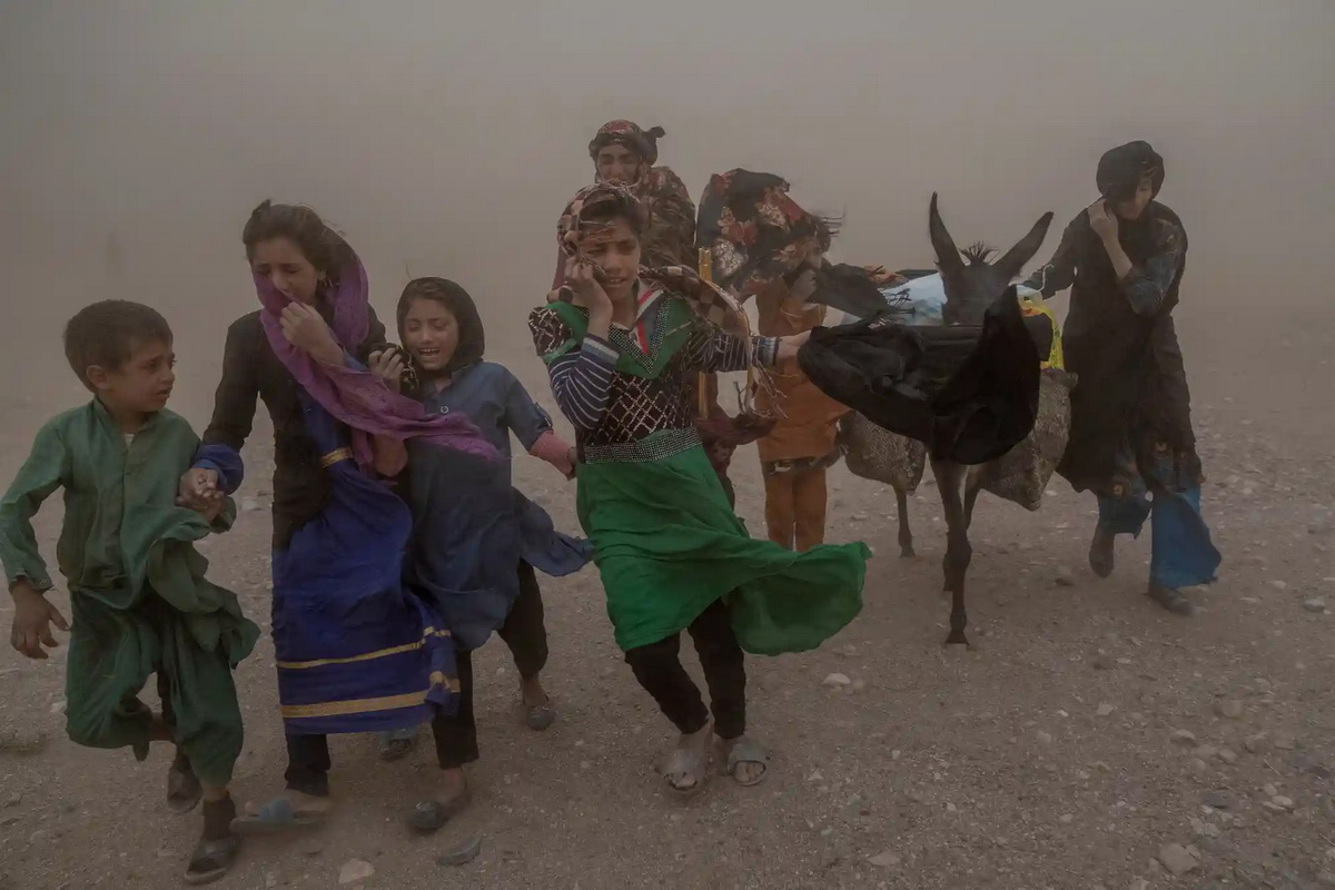 Зенда Джан, Афганистан. Афганские женщины и дети несут пожертвованную помощь в свои палатки во время жестокой песчаной бури после разрушительного землетрясения.