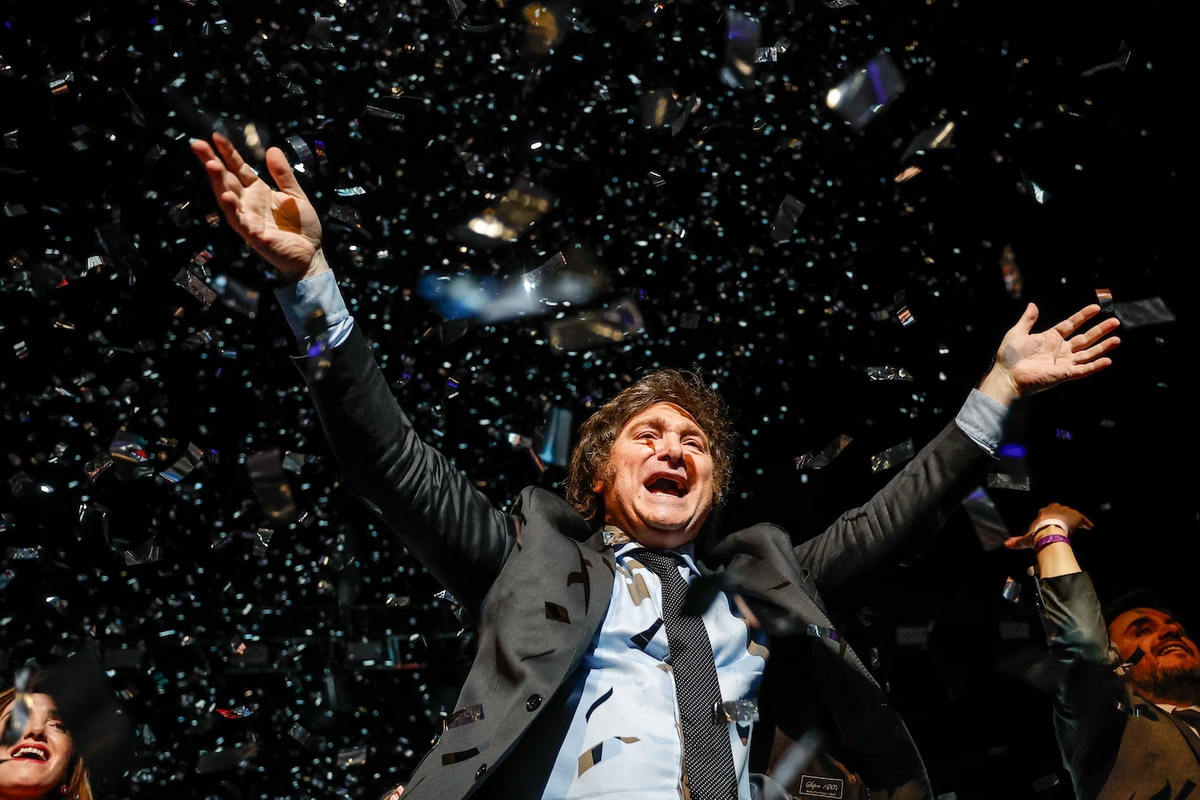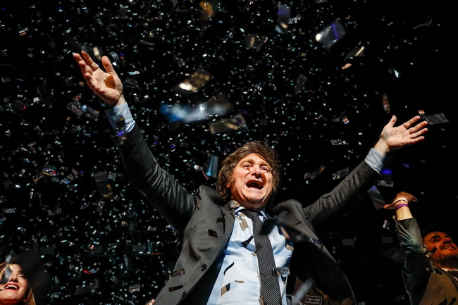 Хавьер Милей, лидер президентской гонки в Аргентине, жестикулирует во время митинга по случаю закрытия предвыборной кампании в среду в Буэнос-Айресе.