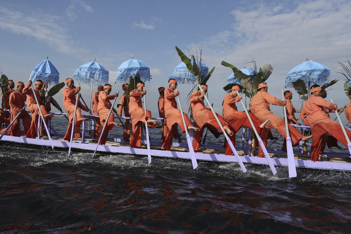 Представители народности иннтха гребут на длинной лодке в процессии, несущей изображения Будды в монастырь во время фестиваля пагод в четверг, 19 октября 2023 года, на озере Инлей, южный штат Шан, Мьянма.
