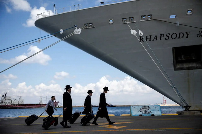 Ультраортодоксальные евреи идут на борт корабля "Рапсодия морей", предназначенного для граждан США и их ближайших родственников, чтобы покинуть Израиль и отправиться на Кипр, подальше от войны.