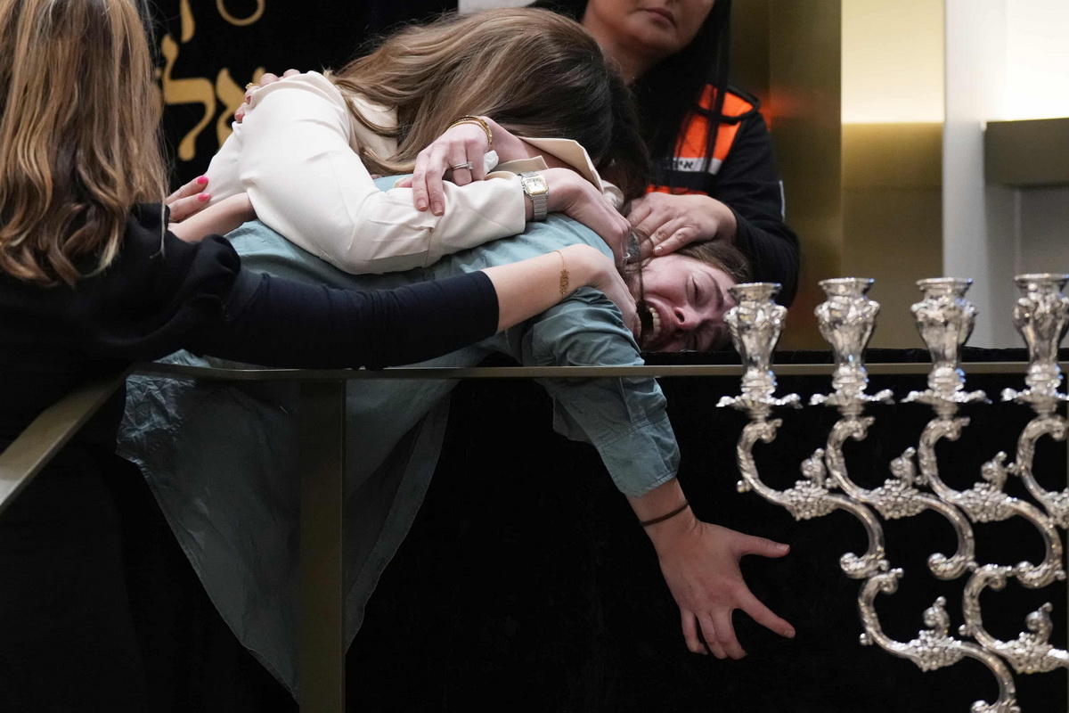Сидней, Австралия. Родственники скорбят у гроба раввина Эли Шлангера, жертвы теракта на пляже Бонди, во время его похорон в синагоге в Сиднее.