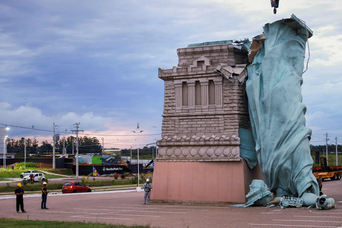 Гуайба, Бразилия. Копия Статуи Свободы лежит поваленная после того, как сильный ветер обрушился на город. Символично.
