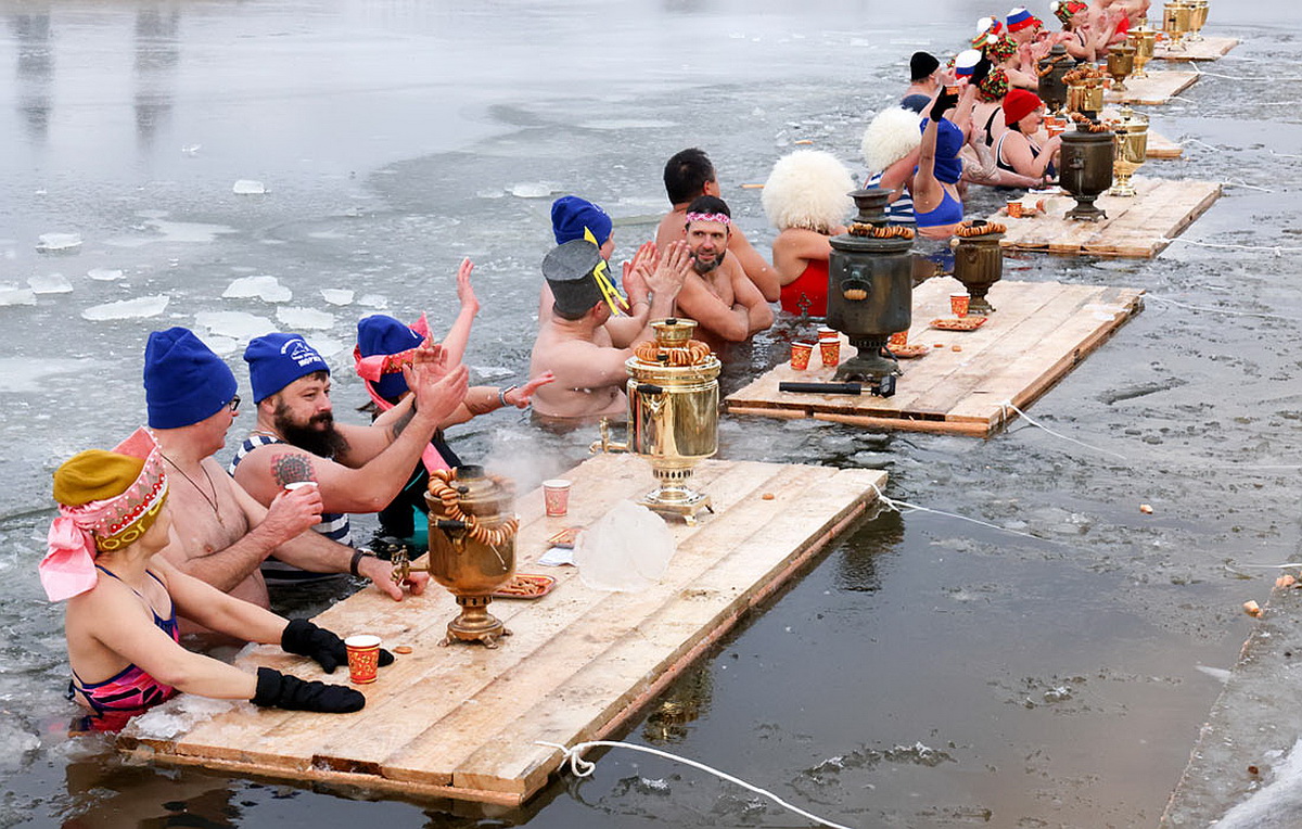 Купальщики во время установления рекорда России по самому массовому чаепитию в проруби в Малоярославце.