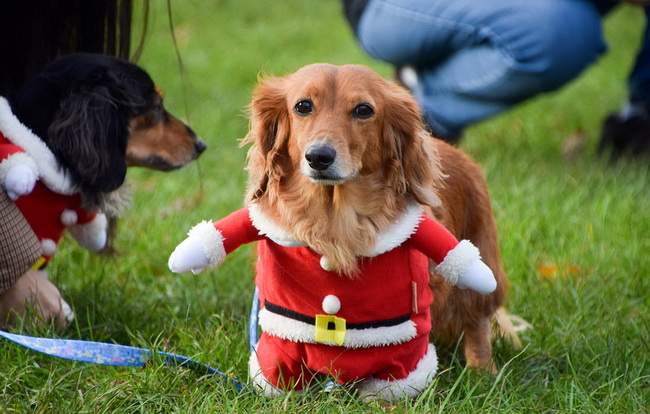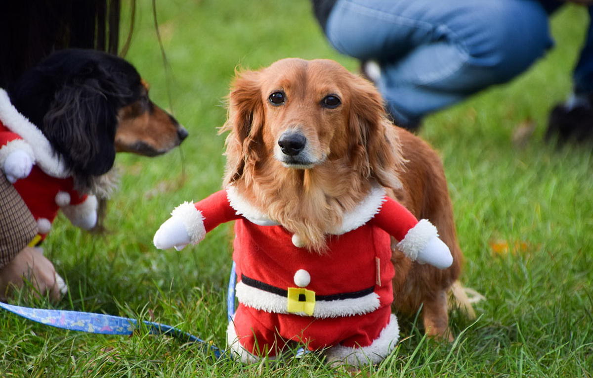 Таксы в рождественских костюмах в Кенсингтонских садах в Лондоне, Великобритания.