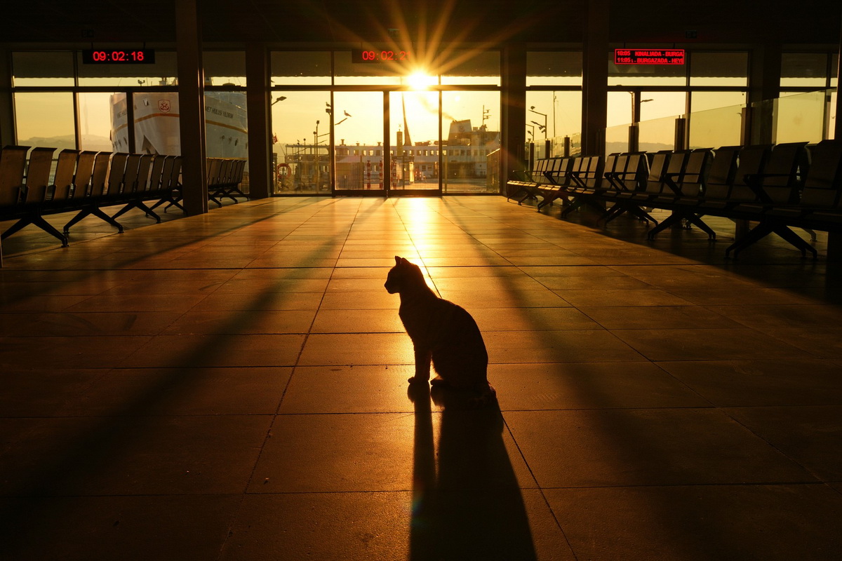 Кот и его тень на паромном терминале Кабаташ на рассвете над Босфорским проливом в Стамбуле, Турция, 18 декабря 2025 года.