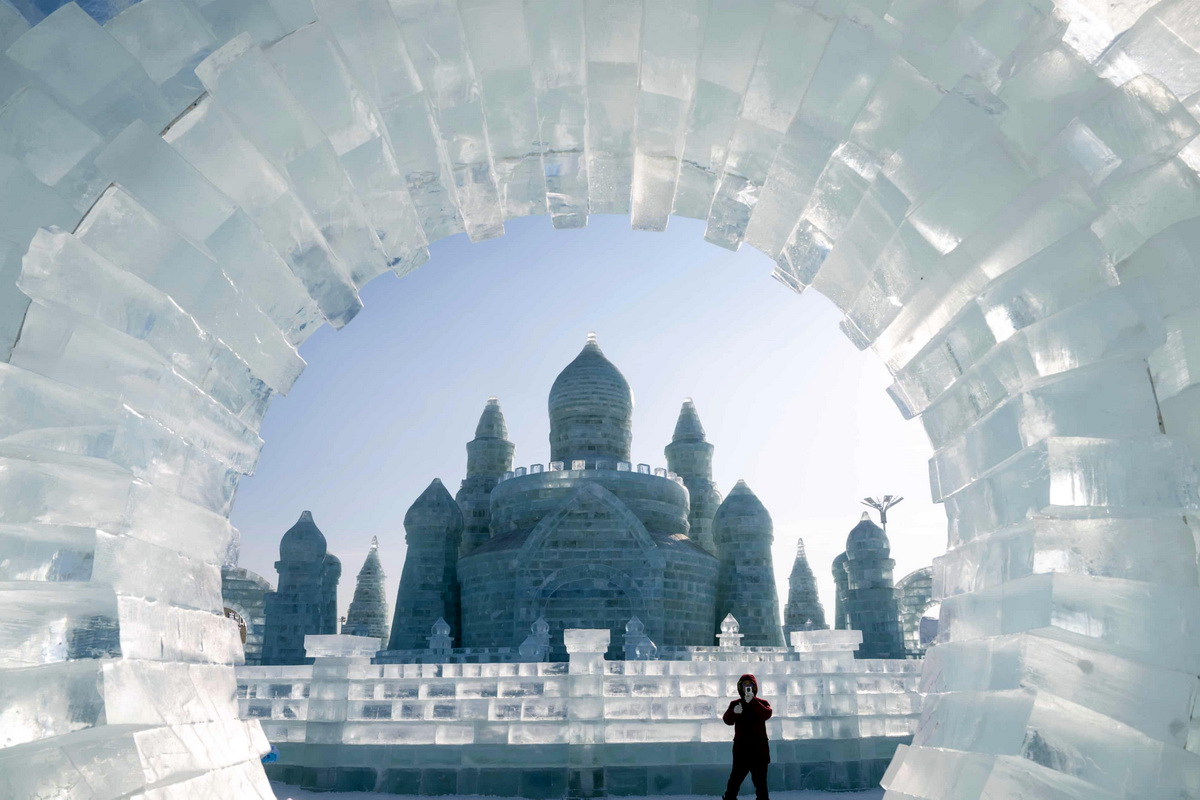 Харбин, Китай. Турист фотографируется на фоне ледяной скульптуры в крупнейшем в мире тематическом парке, посвященном снегу и льду.