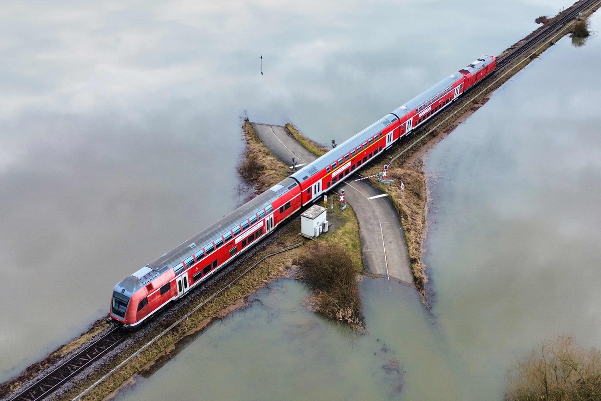 Ниддерау-Эйхен, Германия. Поезд проезжает железнодорожный переезд между затопленными полями. В Западной Европе – наводнение.