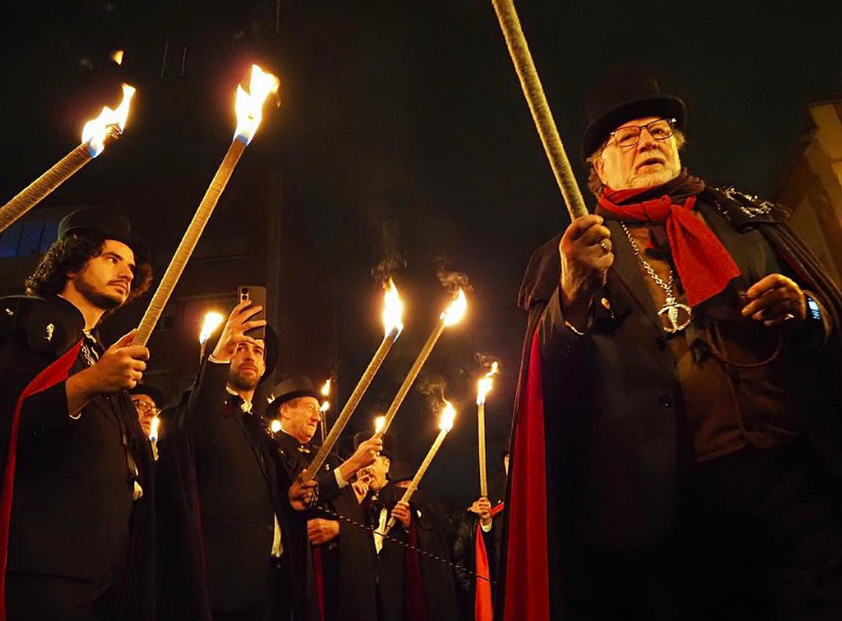18 февраля 2026 года, Мадрид, Испания. Участники в костюмах проходят парадом во время традиционного «Похорон сардины» — сатирического представления, имитирующего похоронную процессию, которая проходит по улицам в сопровождении музыки и персонажей, одетых в чёрное в знак траура. Карнавал в Мадриде подходит к концу, осталось только сожжение сардины на костре.