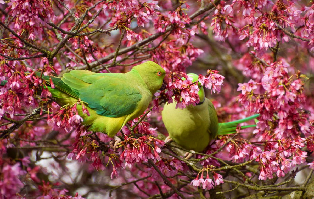 Индийские кольчатые попугаи среди цветущей вишни в Кенсингтонском саду в Лондоне.