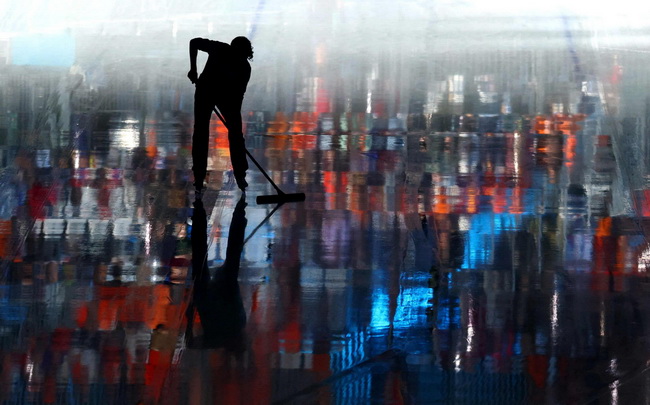 Милан, Италия, Олимпиада. Рабочий чистит лёд перед финалом в мужской командной гонки преследования между Нидерландами и Китаем.