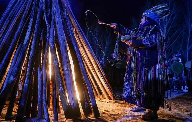 Обряд возжигания священного огня в рамках встречи Шагаа (Нового года) в Тыве.