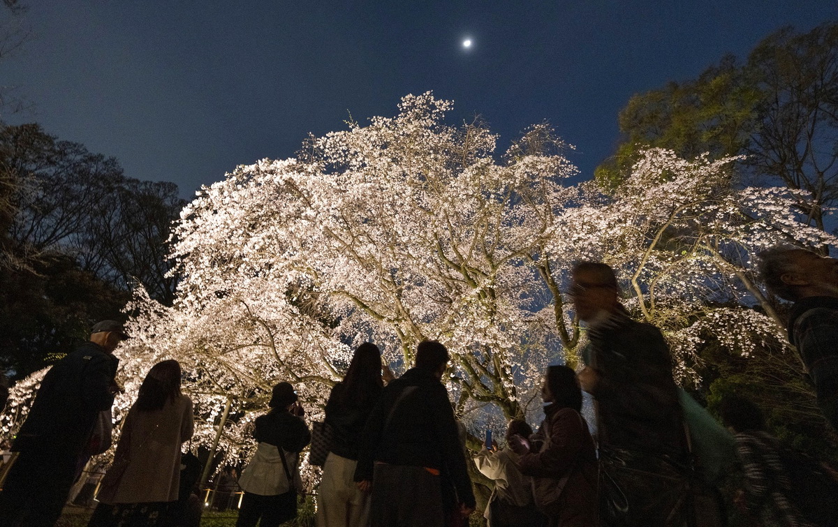 Посетители собираются у плакучей сакуры во время ночной прогулки по садам Рикугиен в Токио 24 марта 2026 года.