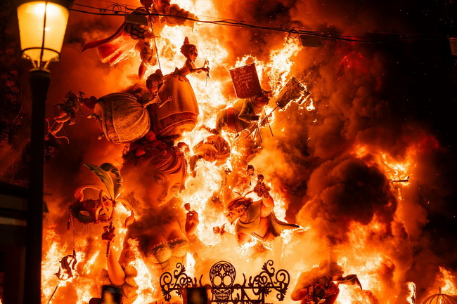 Фестиваль Фальяс завершается сожжением художественного памятника «Фалья Альмиранте Кадарсо-Конде Альтеа» художника Франсиско Гинера Нуньеса в Валенсии, Испания. Во время фестиваля местные жители отмечают приход весны и отдают дань уважения святому Хосе, покровителю гильдии плотников, создавая, а затем торжественно сжигая огромные памятники из дерева, картона и бумаги.