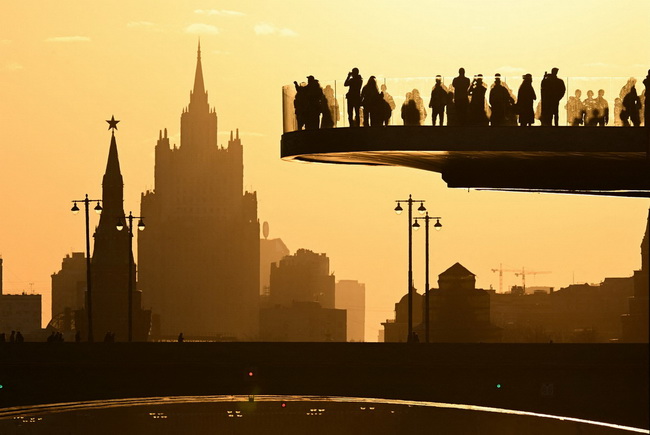 Люди на Парящему мосту в Зарядье на фоне панорамы Москвы 24 марта 2026 года.