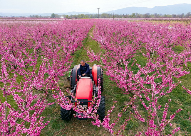 Анастасиос Халкидис, глава сельскохозяйственного объединения Верии, ухаживает за цветущими персиковыми деревьями недалеко от города Верия, Греция, 22 марта 2026 года.
