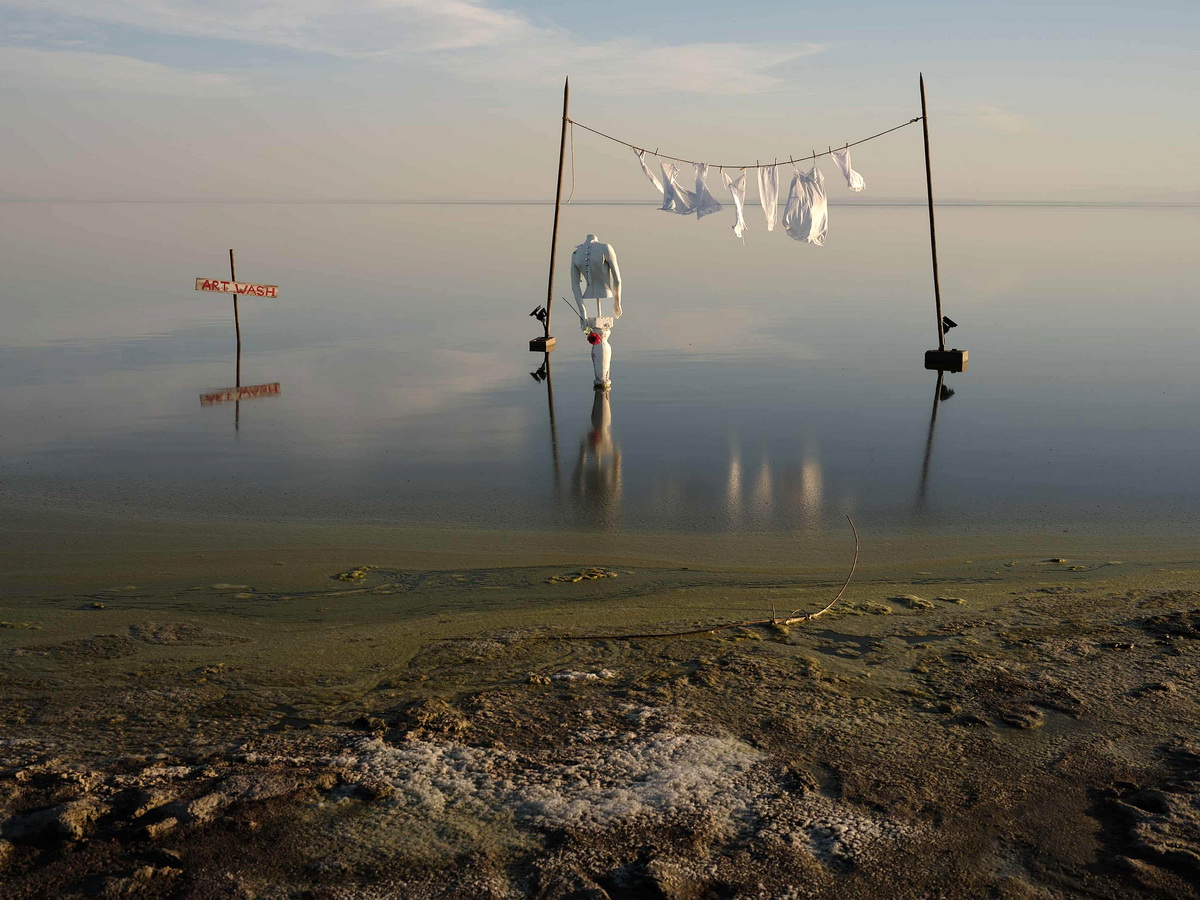 Озеро Солтон-Си в Южной Калифорнии, США. Работа Али под названием «Art Wash». Художник описывает «артвошинг» как культурную версию экологического «гринвошинга». Её суть: корпорации или государства должны финансировать искусство для улучшения своей репутации. В данной работе настроение тревоги, хрупкости мира и опустошения передано мастерски.