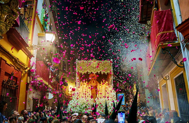Страстная пятница 2026 года. 3 апреля, Севилья, Андалусия, Испания. Процессия «Нуэстра Сеньора де ла Эсперанса де Триана» обычно начинается во время шествия Мадруга рано утром в Страстную пятницу. Участники прошли по городу в сопровождении больших толп людей. Верующие аплодировали, молились и плакали.