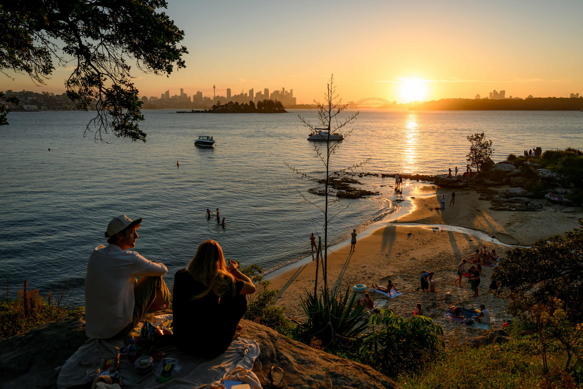 Сидней, Австралия. Вид на пляж Милк-Бич на закате с видом на центр Сиднея и мост Харбор-Бридж. Восторг!