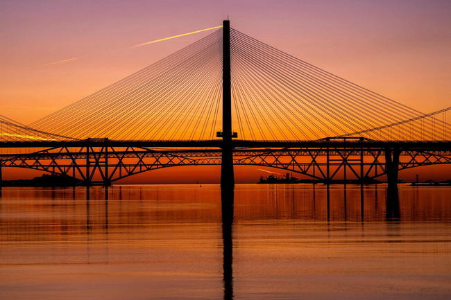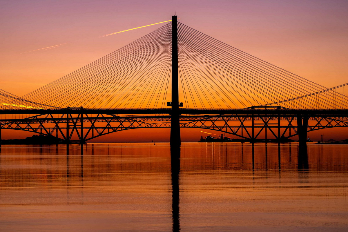 Саут-Куинсферри, Великобритания. Восход солнца над мостами Куинсферри-Кроссинг, Форт-Роуд-Бридж и Форт-Бридж на заливе Ферт-оф-Форт к северу от Эдинбурга. Фото говорит нам о том, что человек был призван воспевать и гармонизировать природу, а не разрушать её.