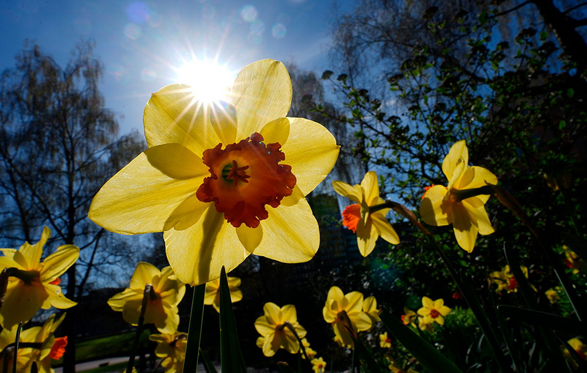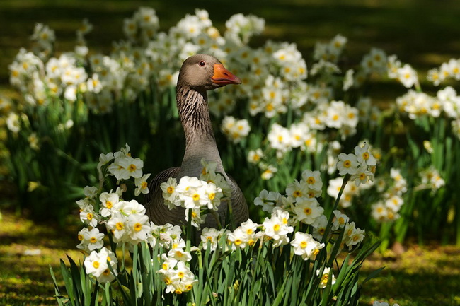 Серый гусь среди нарциссов в Сент-Джеймсском парке в Лондоне.