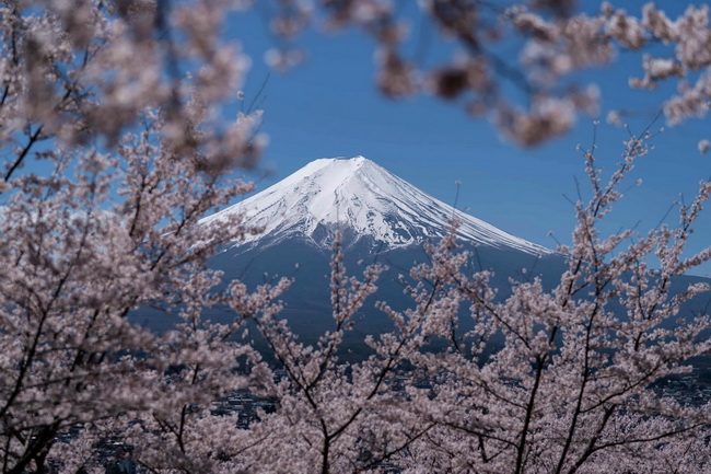 Фудзиёсида, Япония. На фоне цветущих вишневых деревьев в парке Аракураяма Сэнгэн виднеется гора Фудзи. Город Фудзиёсида в этом году отменил свой ежегодный фестиваль в парке из-за чрезмерного наплыва туристов.