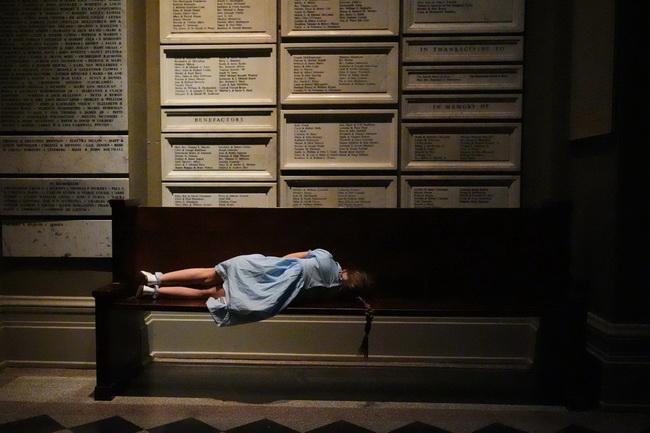 Юная прихожанка отдыхает на скамейке у нефа собора во время пасхального бдения в соборе Святого Иакова в Сиэтле в субботу, 4 апреля 2026 года. Автору чудесным образом удалось создать эффект парения девочки.