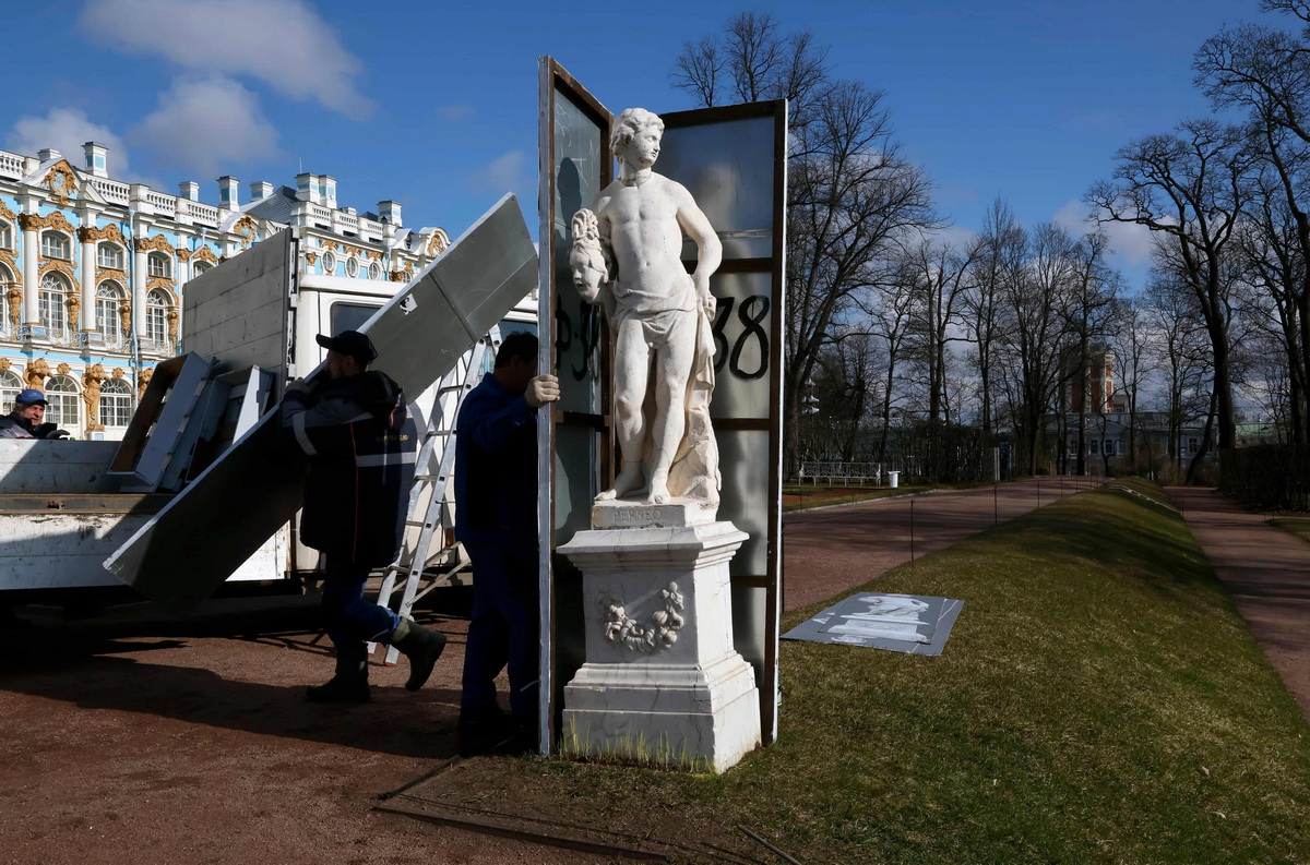 Санкт-Петербург, Россия. После зимы сотрудники музея открывают защитные деревянные футляры с венецианскими мраморными статуями в Эрмитажной аллее. Этот снимок, достойный первой полосы, сделал Анатолий Мальцев (EPA).