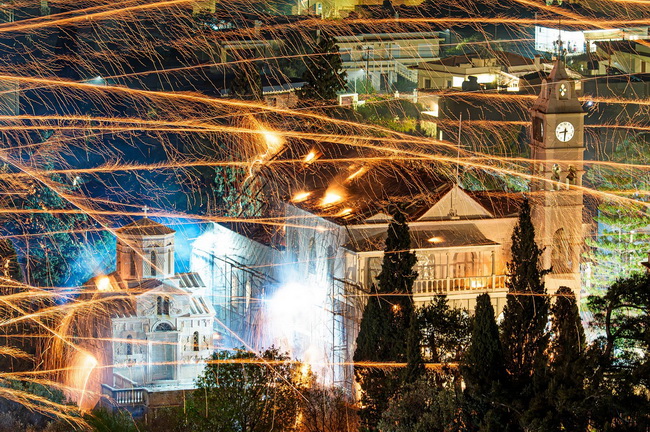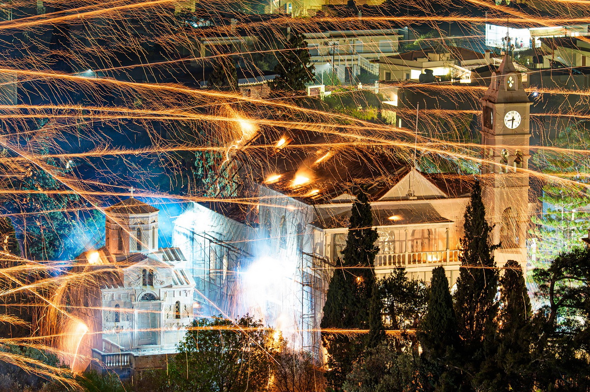 Огненные залпы самодельных ракет освещают ночное небо над деревней Вронтадос на греческом острове Хиос. Две враждующие общины ведут свою традиционную «ракетную войну» в честь празднования Пасхи 12 апреля 2026 года. Тысячи фейерверков были запущены между церквями Святого Марка и Панагии Эритиани, превратив торжественную ночь воскресения в пиршество света и звука.