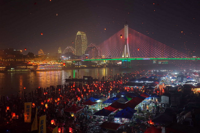 Цзинхун, Китай. Люди запускают фонарики Кунмин — небольшие бумажные воздушные шары — над рекой Ланьцан.