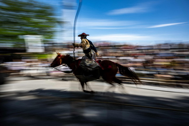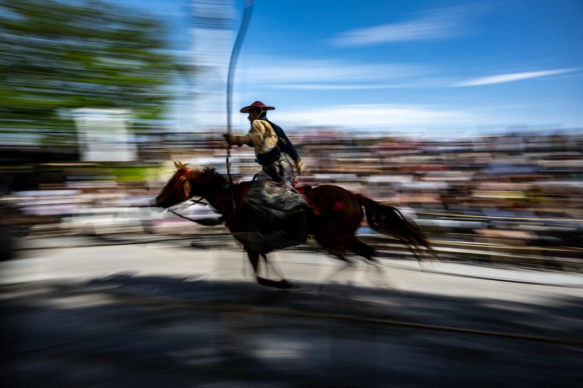 Токио, Япония. Лучник в традиционном костюме верхом на лошади стреляет из лука по мишени во время показательных выступлений самурайских боевых искусств Ябусамэ в парке Сумида.