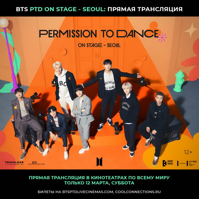 12 марта не пропустите прямую трансляцию: RM, Джин, Шуга, Джей Хоуп, Чимин, Ви и Чон Чонгук встретятся с вами на большом экране. Уникальное шоу, где BTS и АРМИ станцуют вместе в формате LIVE. 12+
