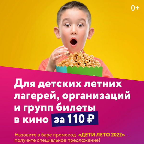 До 31 августа в кинотеатре Синема Парк действует специальная цена билета на групповые посещения для детских лагерей и организаций. Подробности в касcе кинотеатра и на сайте kinoteatr.ru