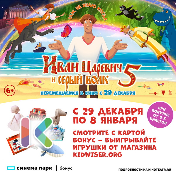 Смотрите новые приключения в мульт-вселенной «Иван Царевич и Серый Волк 5» с 29.12.2022 по 8.01.2023 в кинотеатрах «Синема Парк» и «Формула Кино» с применением карты Программы Лояльности БОНУС – принимайте участие в розыгрыше подарочных сертификатов от магазина нужных игрушек Kidwiser.