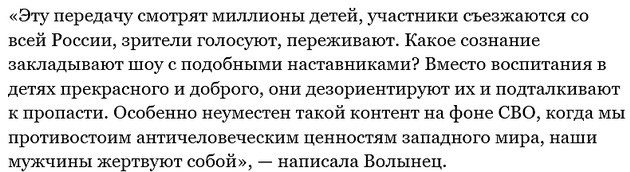 Наконец, представитель власти заметил очевидное: проект Первого канала «Голос.Дети» полностью противоречит культурной политике государства, можно сказать, подрывает её. Уполномоченный по правам ребенка в Республике Татарстан Ирина Волынец назвала Басту, МакSим и Крида «пособниками сатанизма» и намерена обратиться в надзорные органы.