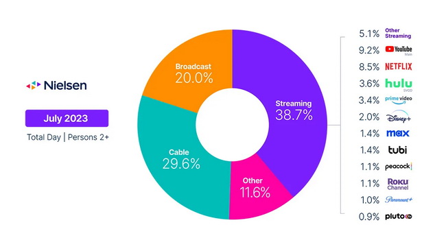 Нерядовая новость: эфирное телевидение и кабельные сети составили менее половины всего телевещания в июле в США. Это случилось впервые за два с лишним года, когда Nielsen стал отслеживать время просмотра по платформам.
