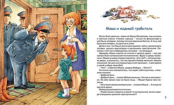 Знаменитые писатели Марина и Сергей Дяченко однажды познакомились с Машей и записали самые интересные детективные истории из ее практики, а художники Ирина Якимова и Игорь Зуев нарисовали, как все было. Получилась очень веселая и увлекательная книжка под названием «Приключения Маши Михайловой», которую «Росмэн» выпустил в серии «Новая детская книга». Книга про Машу, конечно, детская, но и взрослым доставит огромное удовольствие следить за ходом мысли юного гения частного сыска.