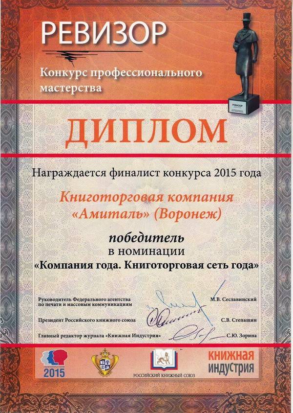 Популярная сеть книжных магазинов «Амиталь», широко представленная в городах Центрального Черноземья, стала победителем в номинации «Компания года. Книготорговая сеть года» по итогам IV Всероссийского открытого конкурса профессионального мастерства «РЕВИЗОР-2015». Учредили конкурс Федеральное агентство по печати и массовым коммуникациям, Российский книжный союз и журнал «Книжная Индустрия».