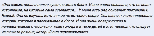 - Я не жажду крови, не хочу судиться. Я считаю, что Яхиной необходимо сделать «работу над ошибками» в своём романе. Готов ей в этом помочь, если она найдёт в себе силы обратиться ко мне. И, разумеется, я выступаю за то, чтобы авторские права были соблюдены, хотя бы ссылками и указаниями на источники. В оправдания Яхиной я не верю, – сказал историк.