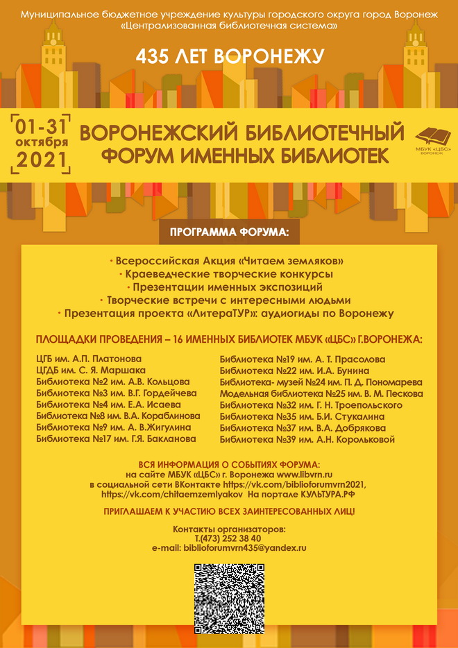 Контакты организаторов: (473) 252 38 40 e-mail: biblioforumvrn435@yandex.ru