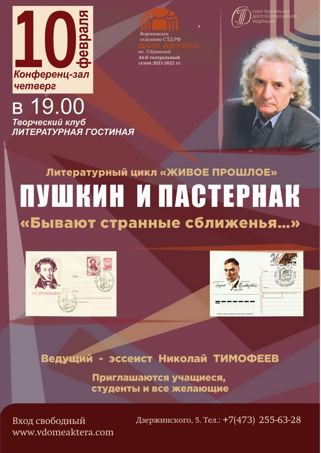 …И вот, спустя 10 лет, Николай Тимофеев решил возобновить свой цикл «Живое прошлое» темой «Пушкин и Пастернак: «Бывают странные сближенья…», или Пересекающиеся параллели» Дебют планировался на 10 февраля. Этот день особо памятный в истории культуры России. 10 февраля /нов. ст./ 1837 года умер Александр Пушкин. 10 февраля /того же ст./ родился Борис Пастернак. К сожалению, по известным всем нам обстоятельствам, встреча в Доме актёра 10 февраля была отменена. А позже перенесена на 10 марта.