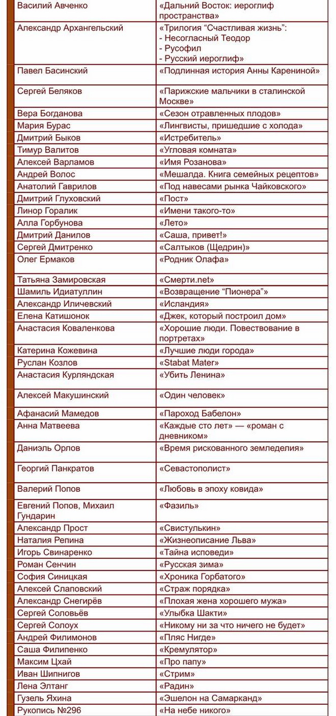 19 апреля в 14:00 премия «Большая книга» объявила длинный список. Председатель Совета экспертов премии Михаил Бутов, председатель Литературной академии Дмитрий Бак и эксперты премии: заместитель главного редактора журнала «Октябрь» Алексей Андреев, заведующая отделом прозы журнала «Знамя» Елена Холмогорова и член редколлегии журнала «Новый мир» Ольга Новикова назвали 48 произведений, включённых в лонг-лист.