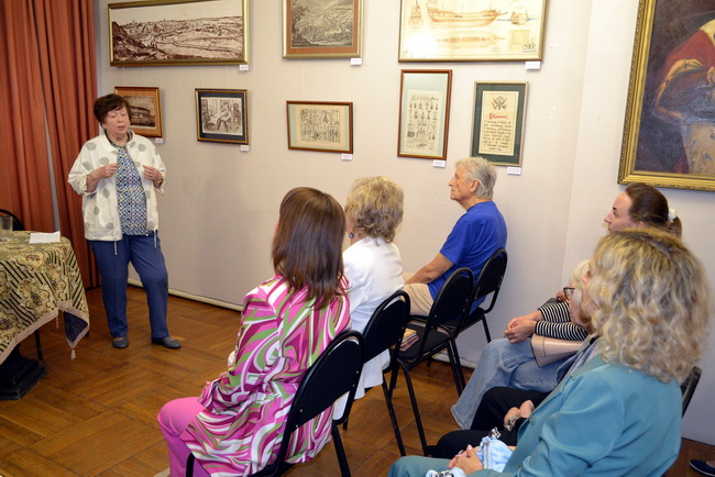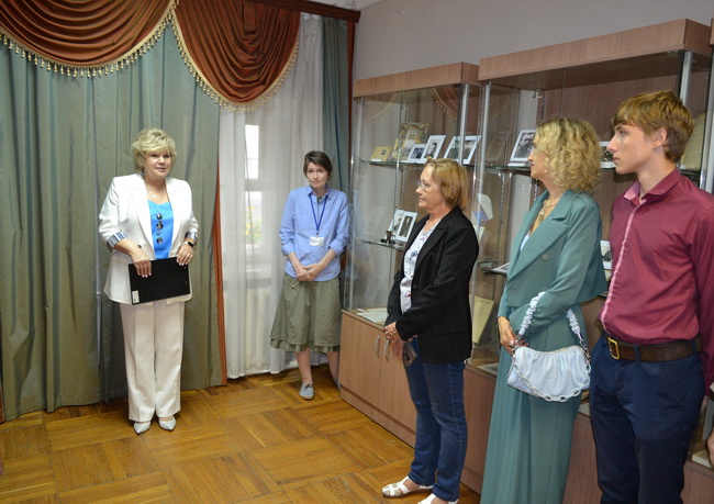После этого главный научный сотрудник музея Ольга Дворядкина провела экскурсию по выставке. Её первый раздел знакомит посетителей с детством и юностью писателя. В витринах представлены фотографии родителей и братьев Андрея Платонова, подлинные документы и артефакты.